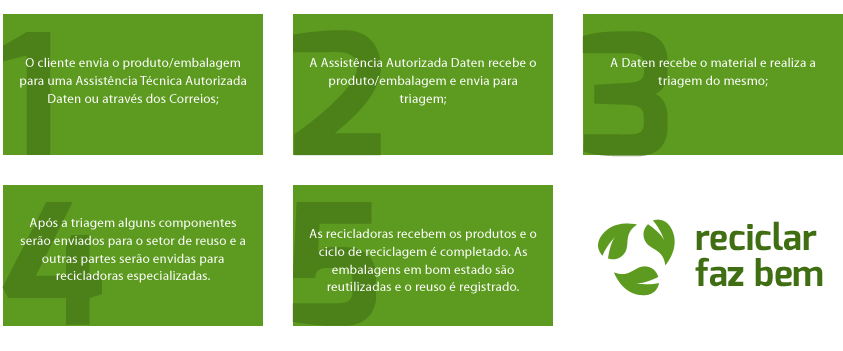 1- Envio as Assistências Autorizada Daten: O consumidor deve se dirigir a uma Assistência Técnica Autorizada onde poderá deixar os seus produtos e/ou embalagens para reciclagem sem qualquer tipo de custo.